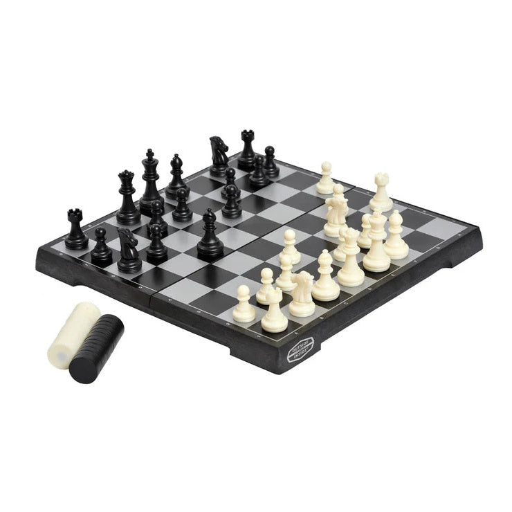 Includes: Magnetic game board, game pieces for chess and checkers, instructions, and travel bag