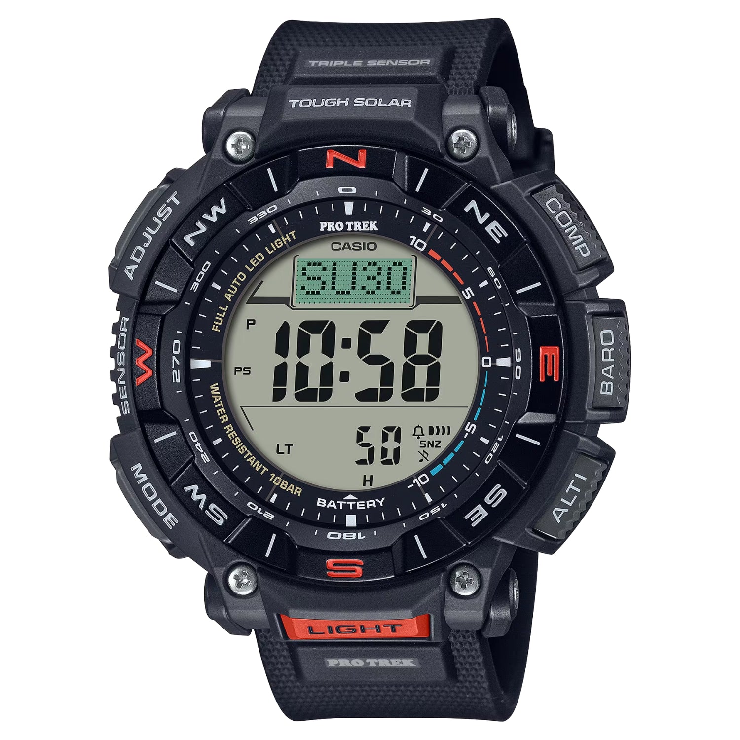 The duplex LCD lays out separate layers for the compass graphics and the clock functions, enabling a larger compass display for better legibility and easier navigation in a design that is both functional and beautiful. The rotating bezel makes it simple to record compass readings, and the Tough Solar charging system keeps the advanced functionality on the go.