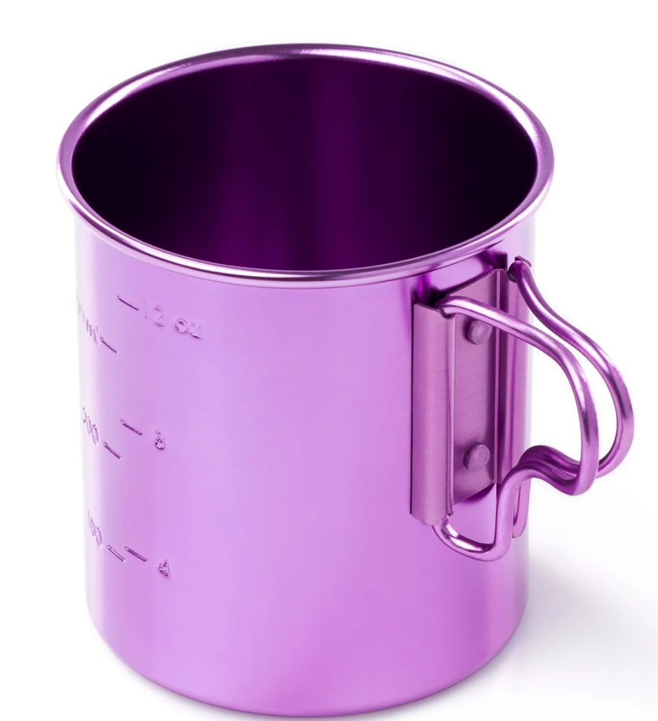 This ultra-lightweight camping and hiking cup made of high-grade aluminum features folding handles and stamped-in graduations.