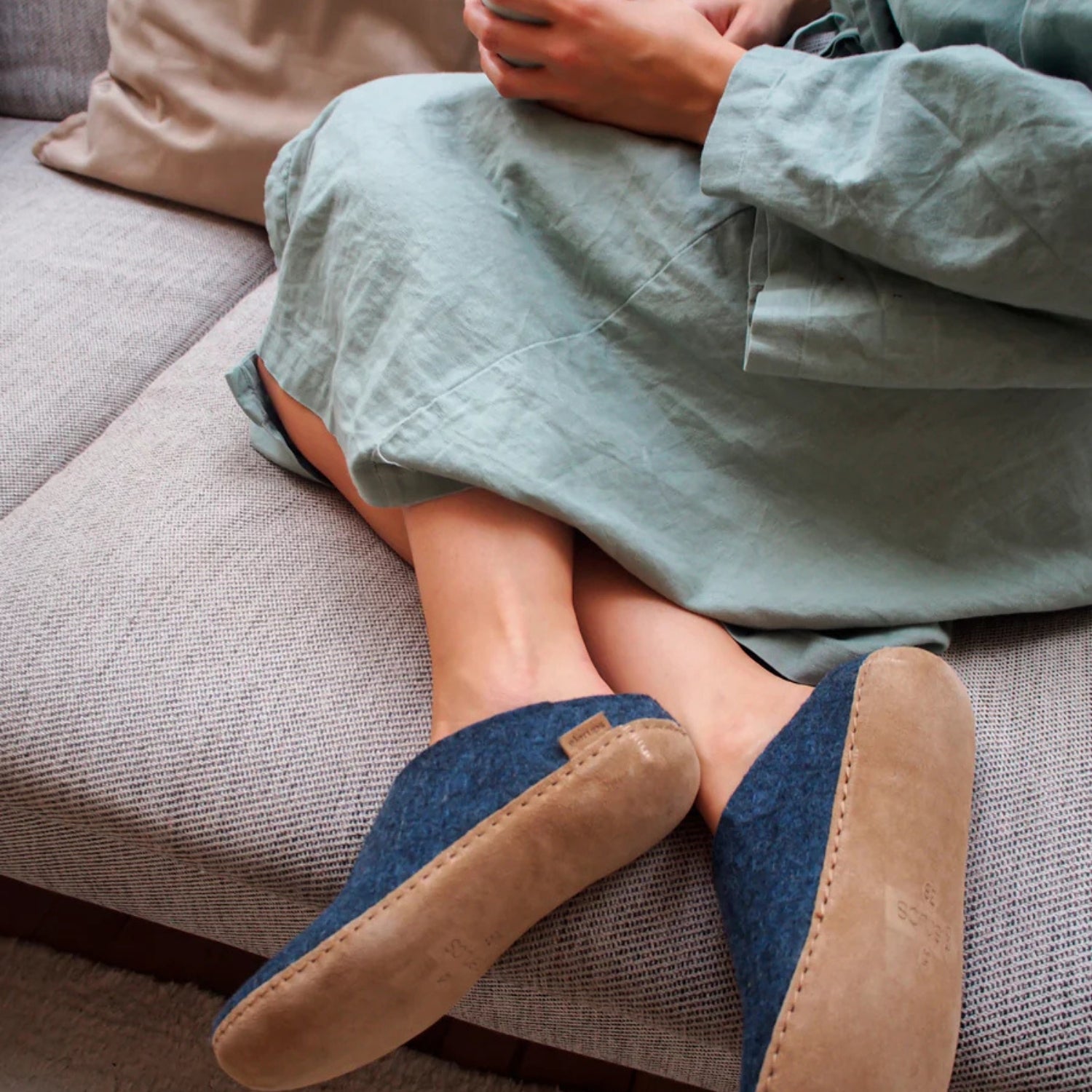 The slippers are designed and produced with respect for animal, people and nature. Choose the slip-on model if you want them easy on and off and want to give your tired feet a little extra love.