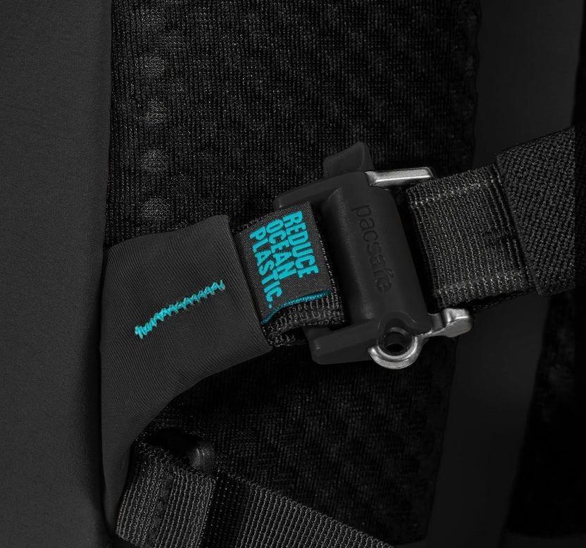 The Pacsafe ECO collection is our most sustainable collection yet by using almost 100% recycled materials and components. When you need something compact yet spacious for a day trip or hike, this 18L backpack is your new go-to. The lightweight design has plenty of room with multiple pockets and compartments to organize your essentials. Other features include a breathable mesh panel that is ergonomically designed to support your back and to create excellent airflow to keep you dry. The ergonomically-designed shoulder straps offers better support and carrying comfort. Stay hydrated on the move with two large water bottle pockets and a compartment for a water bladder or laptop. Made with rPET equivalent to 10 recycled plastic bottles, which were used in the lining, mesh, webbing, and labels. The outer shell fabric and certain buckles were made with ECONYL? regenerated nylon, which comes from waste such as discarded fishing nets, fabric scraps, carpets and industrial plastic.