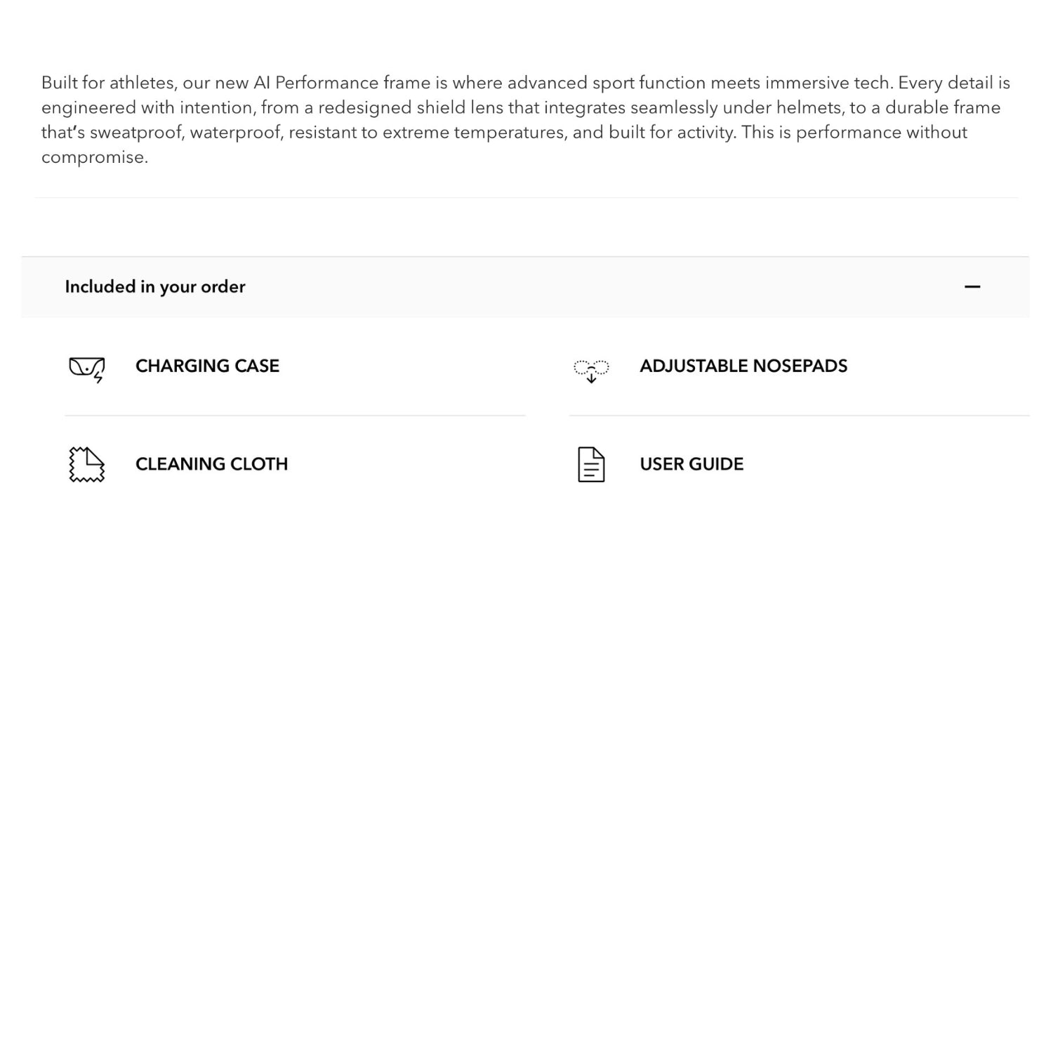 Built for athletes, our new AI Performance frame is where advanced sport function meets immersive tech. Every detail is engineered with intention, from a redesigned shield lens that integrates seamlessly under helmets, to a durable frame that’s sweatproof, waterproof, resistant to extreme temperatures, and built for activity. This is performance without compromise.